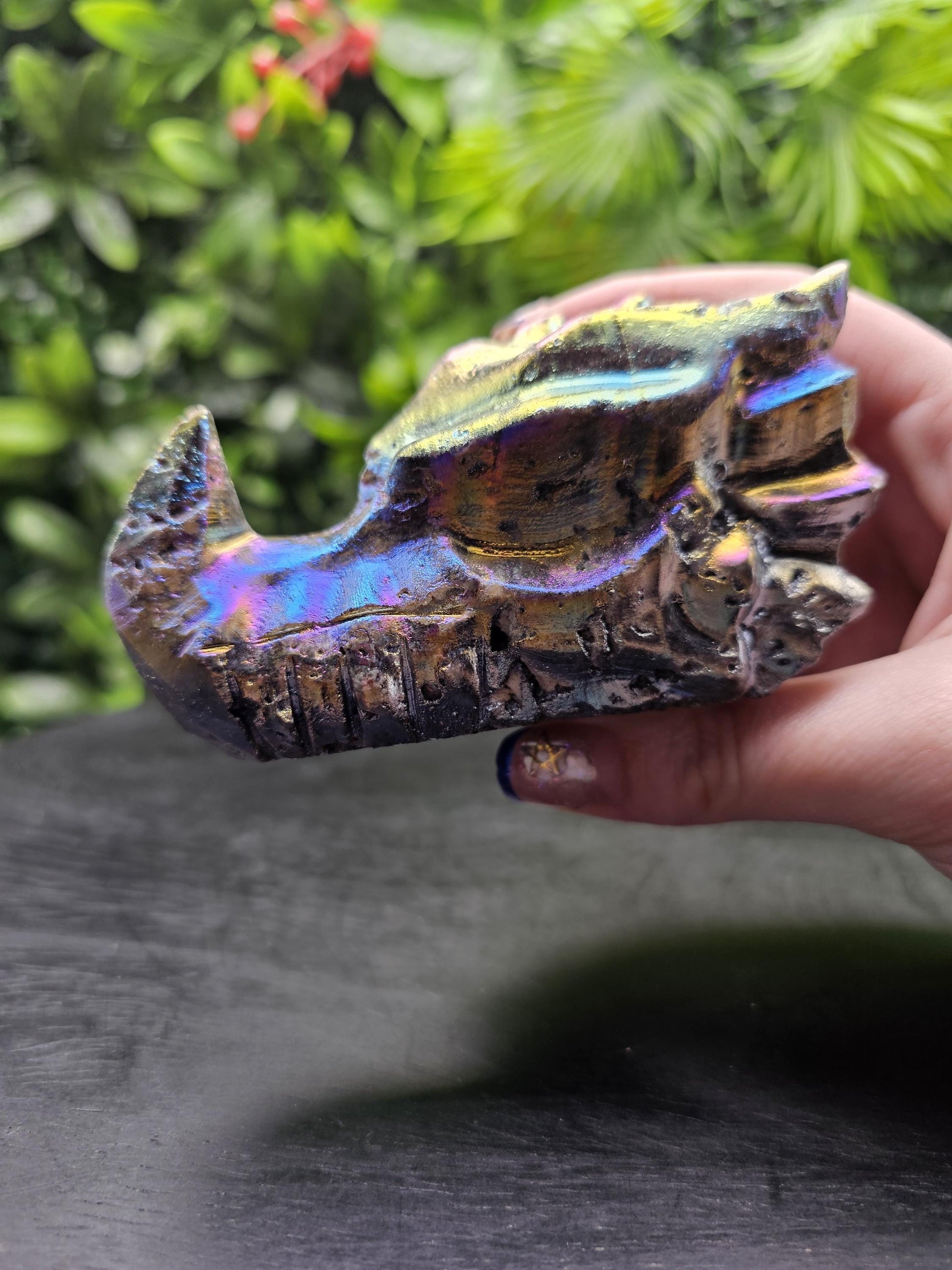 This intricately carved dragon head is crafted from sphalerite, a mineral known for its vibrant, rainbow-like iridescence. The captivating colors shimmer and shift depending on the light, creating a truly unique and magical piece. The dragon‘s head symbolizes power, strength, and good fortune.