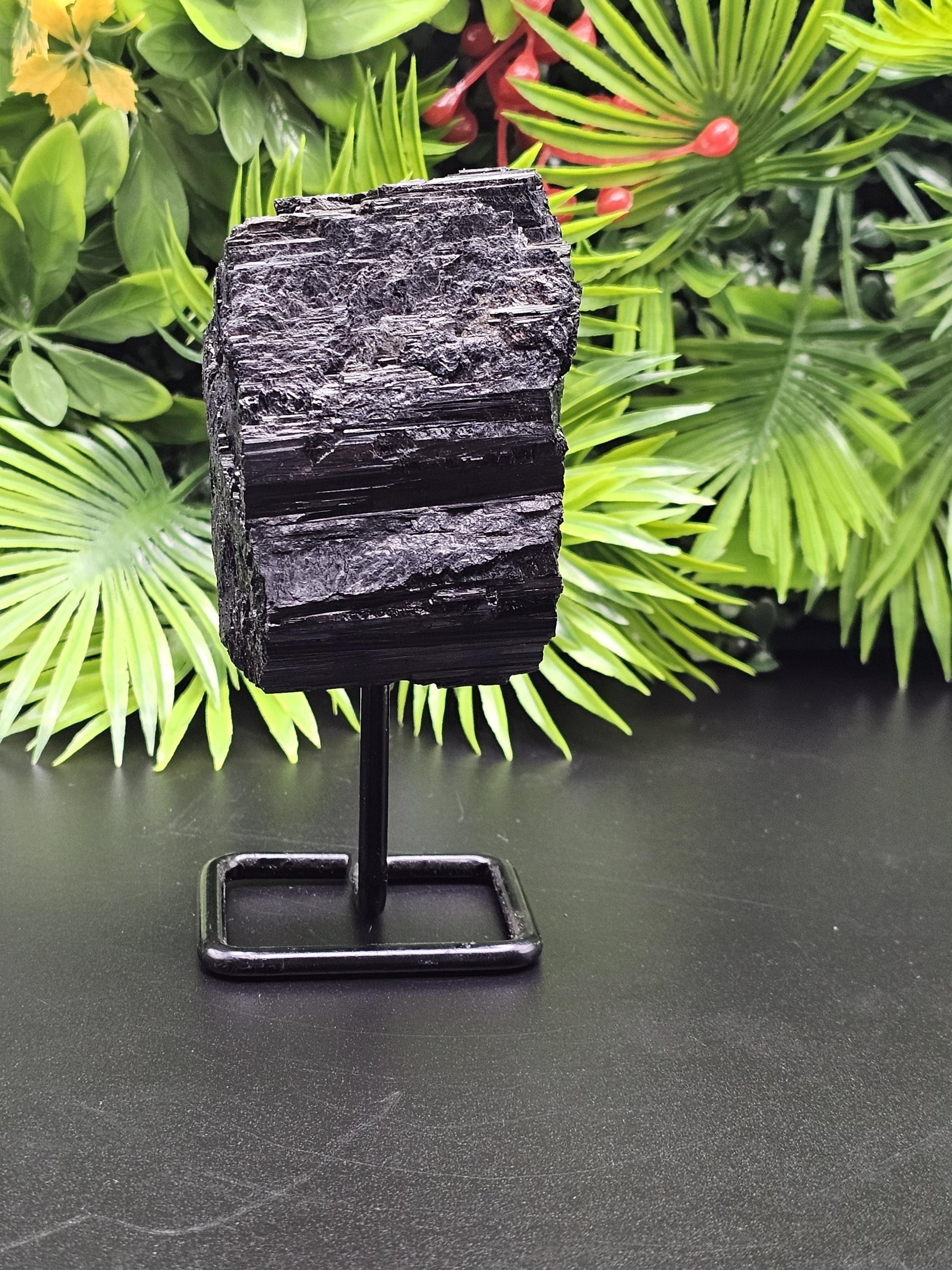 This Black Tourmaline specimen offers a unique combination of aesthetic appeal and metaphysical benefits. The raw, natural crystal is mounted on a sleek metal stand, creating a visually striking piece suitable for any decor style. Black Tourmaline is renowned for its protective properties, shielding against negative energy, psychic attacks, and electromagnetic smog. It also promotes grounding, stability, and security, making it an ideal addition to any space where you seek to enhance positive energy and well-being. Each crystal is carefully selected for its quality and unique characteristics, ensuring a one-of-a-kind piece that brings both beauty and energetic balance to your environment. The sturdy metal stand provides a secure and elegant display, allowing the crystal to be showcased on a desk, shelf, or altar.