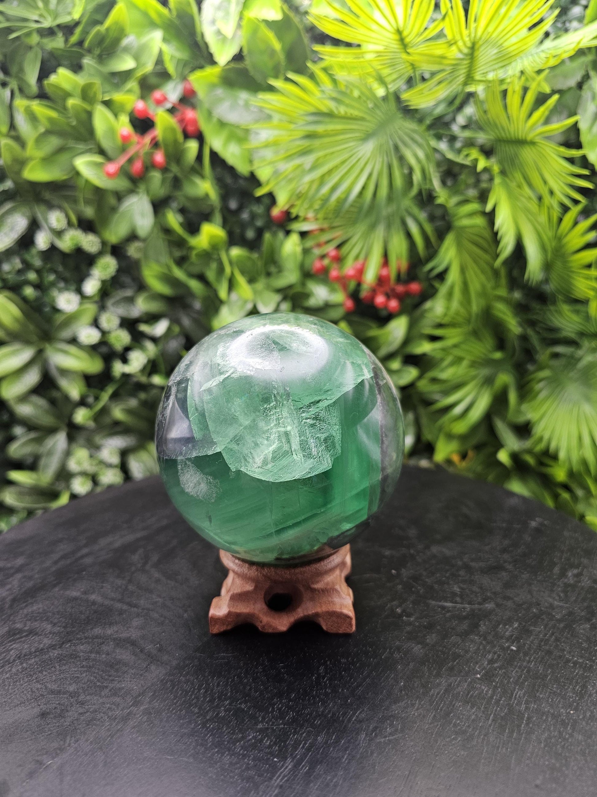 Behold the beauty of this massive Rainbow Fluorite sphere! This stunning piece comes with its own wooden stand, ready to showcase its dazzling array of colors. Mostly green with captivating hints of purple, this sphere is filled with rainbow inclusions that catch the light and create a mesmerizing display. Rainbow Fluorite is believed to bring clarity, focus, and harmony, making this sphere not just a visual delight but also a powerful addition to any crystal collection or living space.