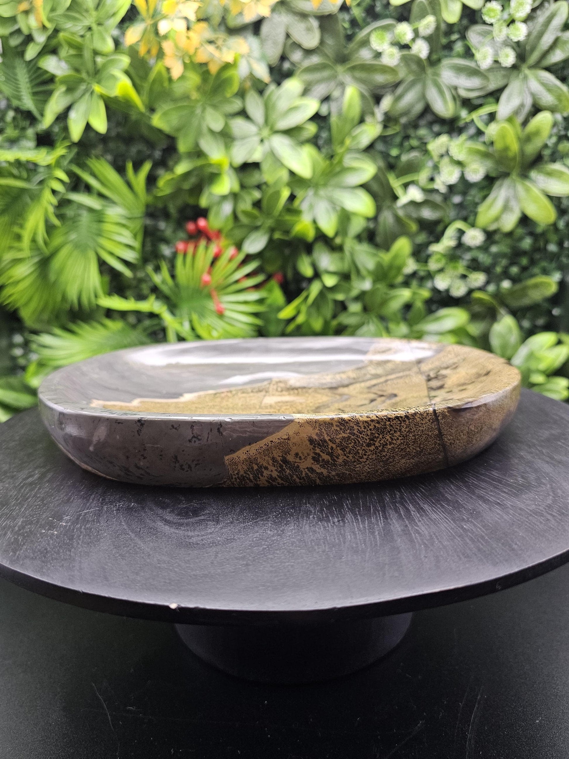 Bring the beauty of the earth into your living space with this stunning large Picture Jasper plate. Featuring mesmerizing dendritic patterns that resemble miniature landscapes, this piece is a true work of art.