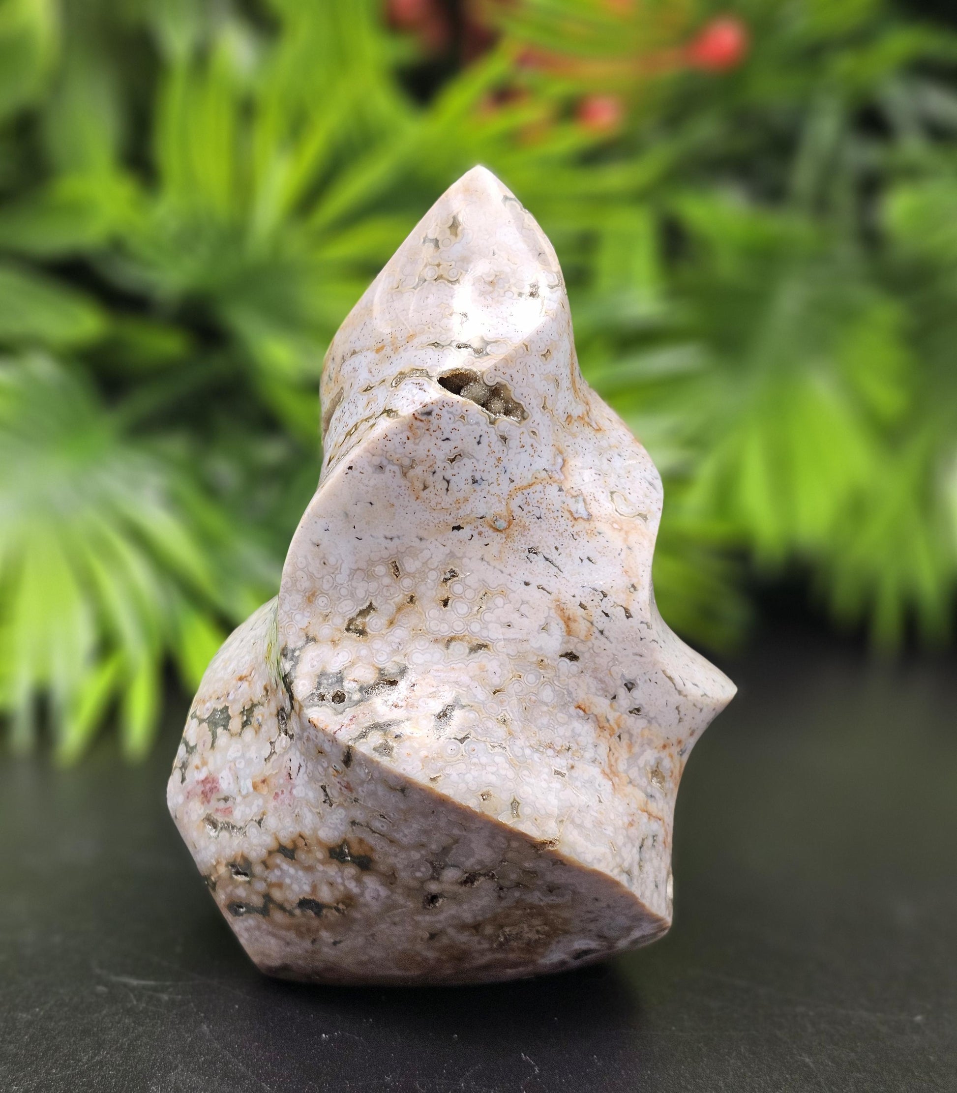 This stunning Maravoto Ocean Jasper flame is a truly unique piece that brings both beauty and spiritual benefits to your space. The mesmerizing swirls and vibrant colors characteristic of Ocean Jasper make it a perfect accent for any home or office decor.
