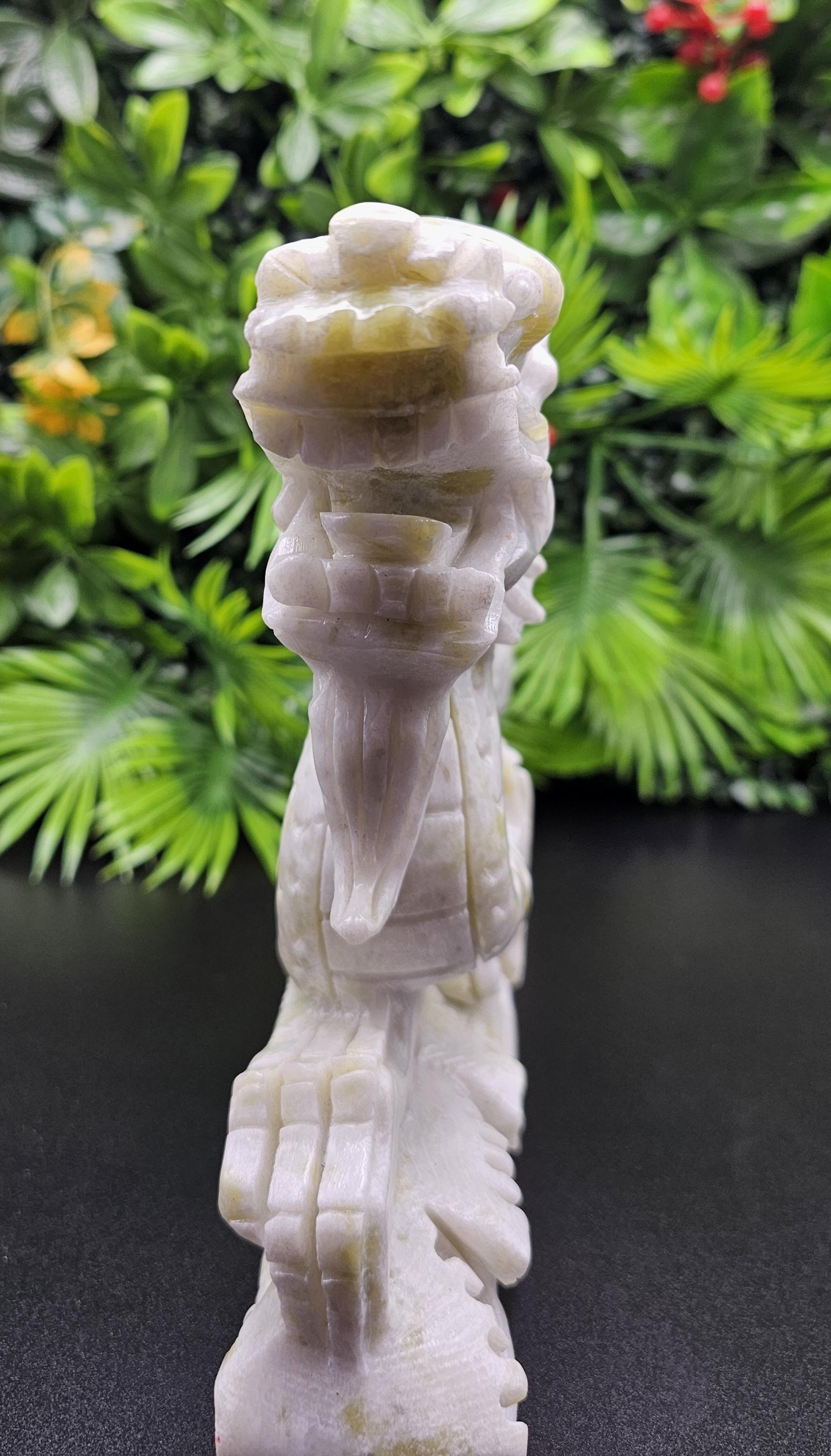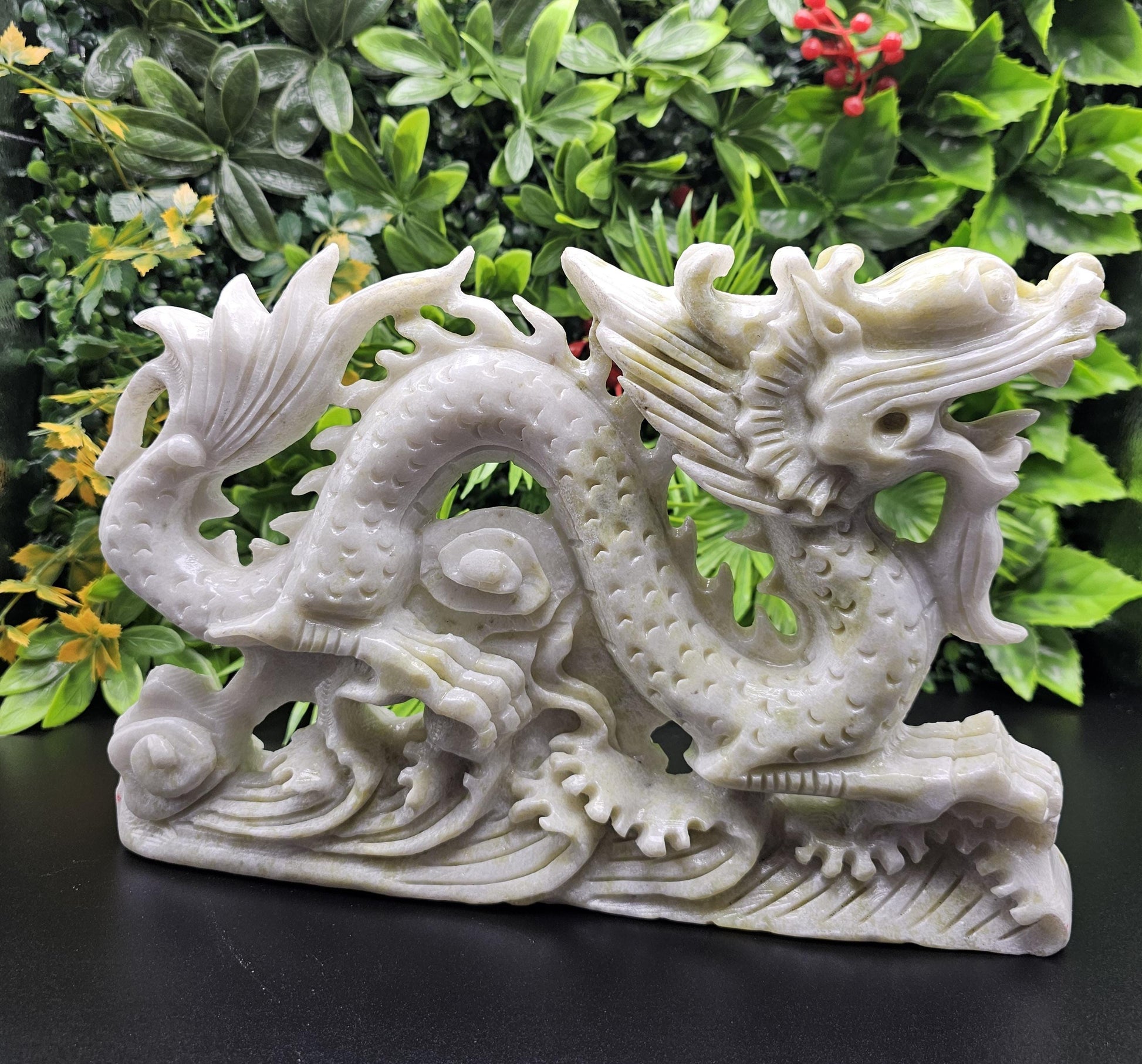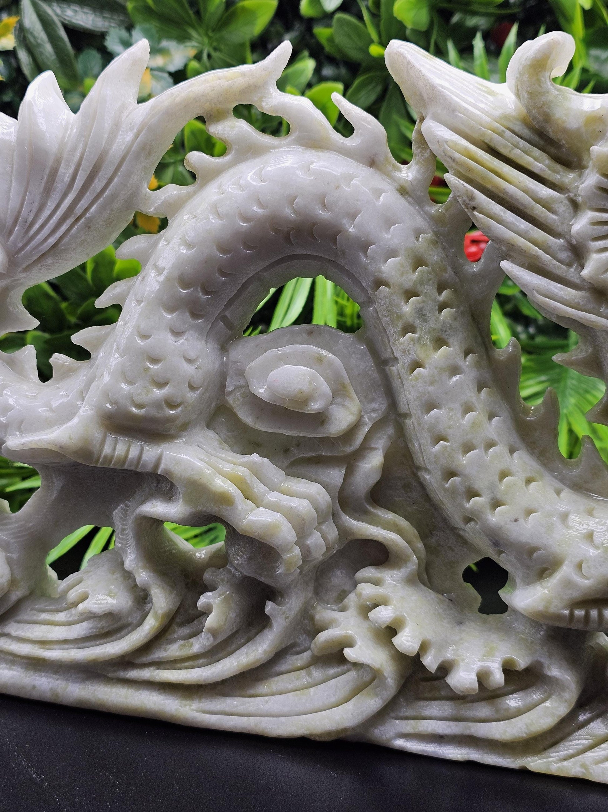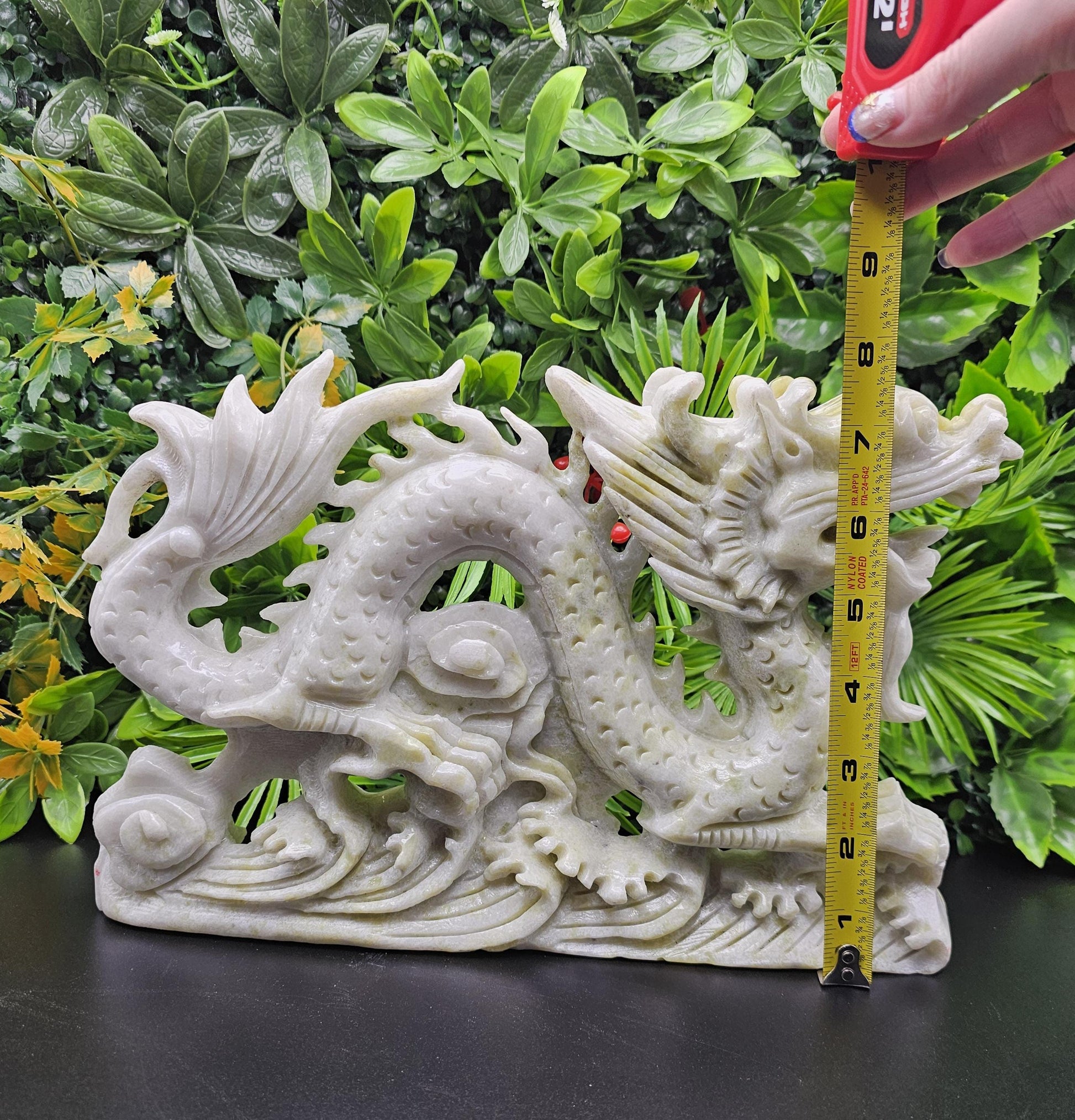 Check out this massive White and Green Jade Hand-Carved Chinese Dragon, measuring about 11 inches long, 7.5 inches tall, and 2 inches wide. This stunning piece makes a bold statement and is perfect for any space.
