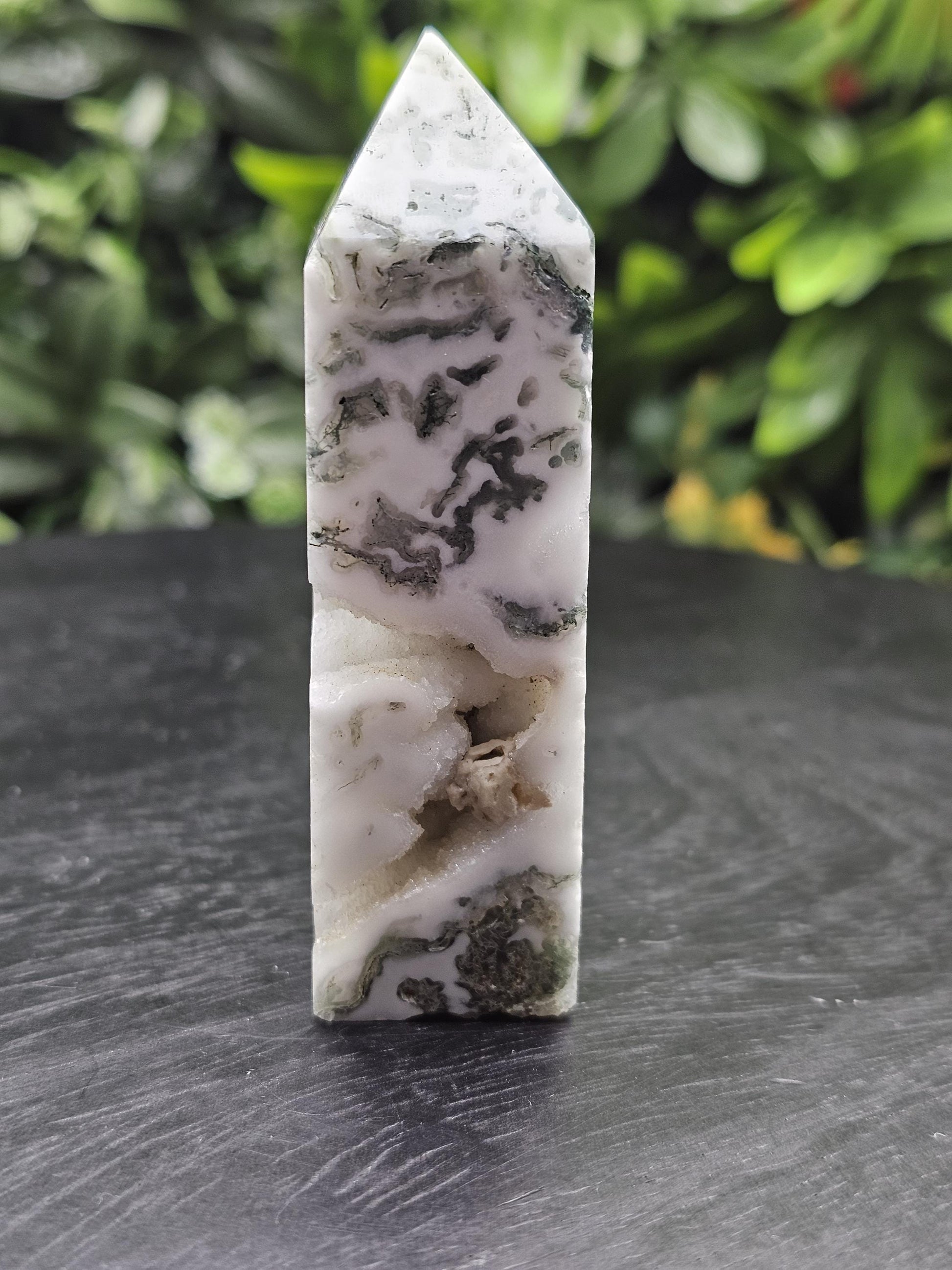 This moss agate tower showcases beautiful green and white swirls, highlighted by a stunning druzy pocket that sparkles with tiny crystals. The combination of colors creates a serene and calming aesthetic, perfect for any space.