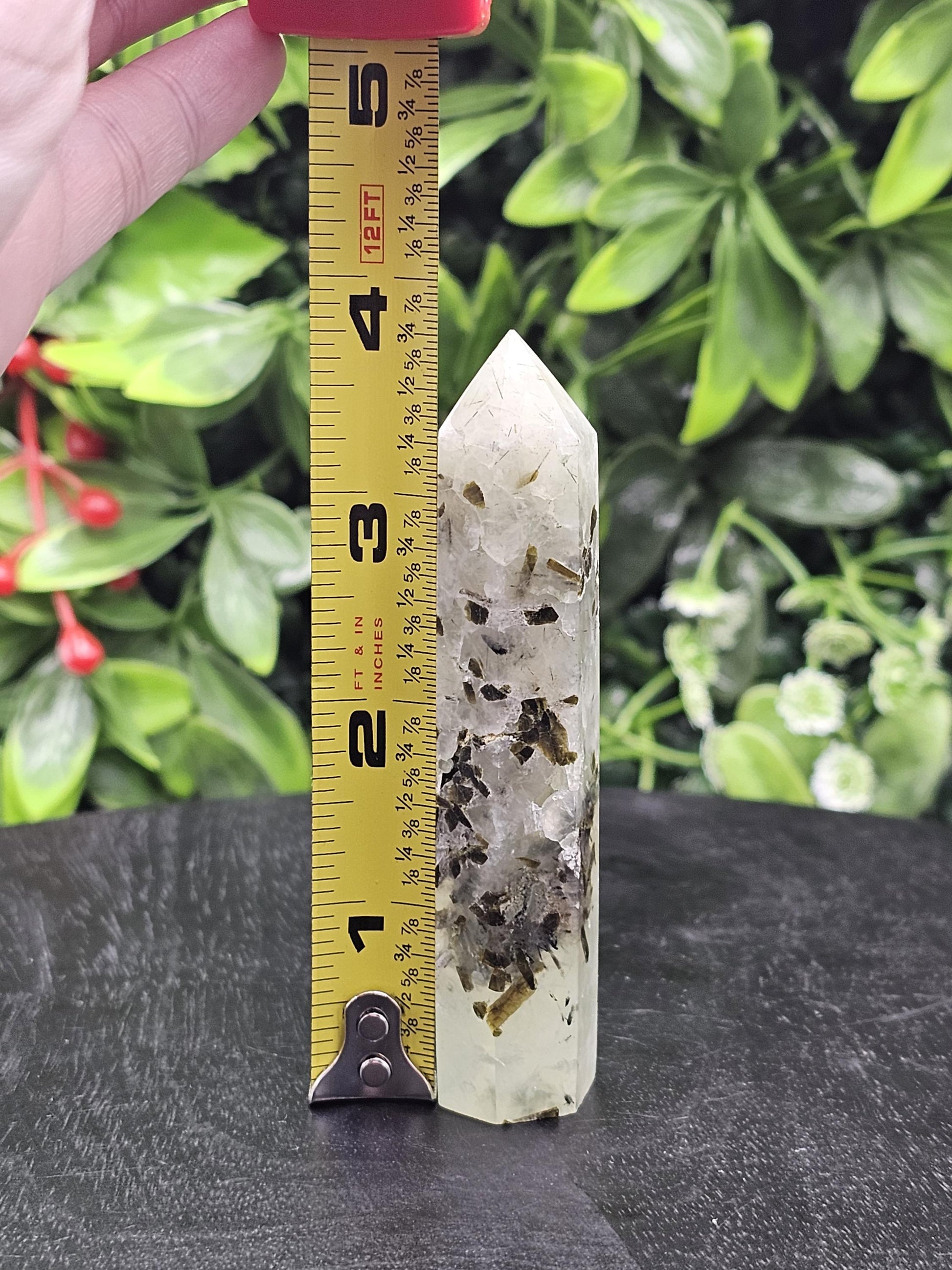 This high-quality prehnite crystal tower stands approximately 4 inches tall and showcases the stone‘s natural, serene green hues. Known as a stone of unconditional love and the healer‘s stone, prehnite is believed to enhance spiritual growth, intuition, and inner peace. It is said to connect the heart with the will, promoting a sense of harmony and balance. This beautiful crystal tower is perfect for meditation, energy work, or simply as a stunning addition to your crystal collection. Embrace the calming and nurturing energy of prehnite with this exquisite tower.