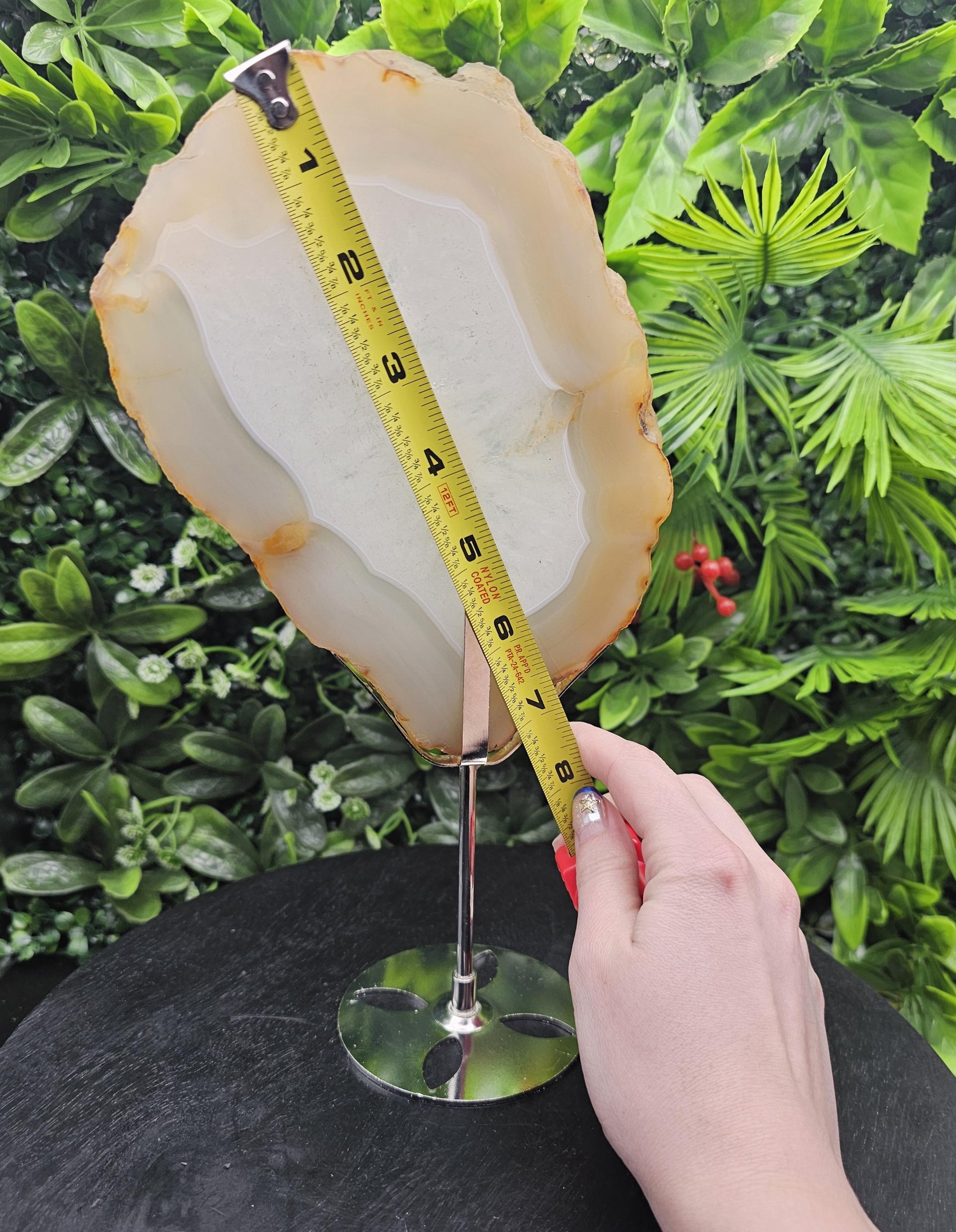 This stunning huge Agate slice, set on a sleek metal display stand, is truly one of a kind. The unique piece showcases beautiful variations of yellow, white, and clear hues, creating a mesmerizing visual effect. The natural patterns and colors within the Agate make it a captivating centerpiece for any room, adding a touch of elegance and sophistication.